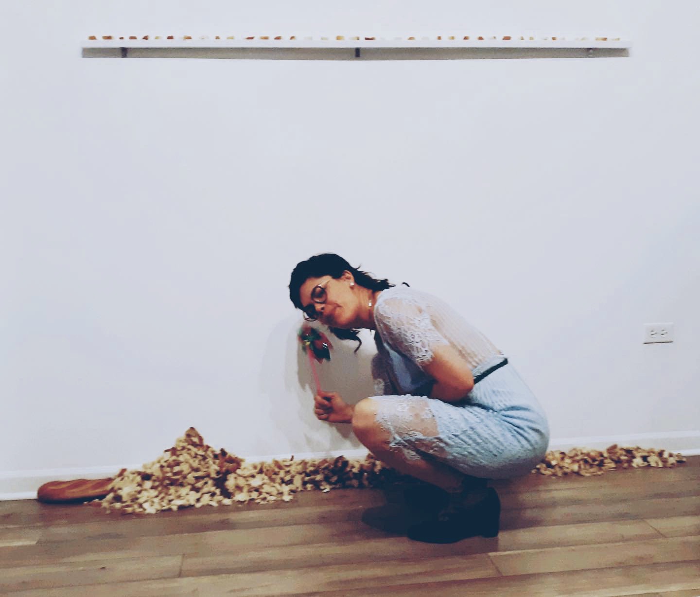 We inherit from our upbringing an emotional structure that we repeat over and over, because it is all that we know. We must undo what it does to us in the present. We must rewire our brain, unlearn, un-know, make space to know something different so that, in this case, the experiences, the breadcrumbs, aren’t all that we expect of relations. The repetition of old, salvaged bits of bread on the brink of decay presents a poetics of grief, a ritual of letting go, a performance of healing trauma. This assemblage makes for a much different, more beautiful landscape than any crumb, a learned emotional structure transmuted within this open process.